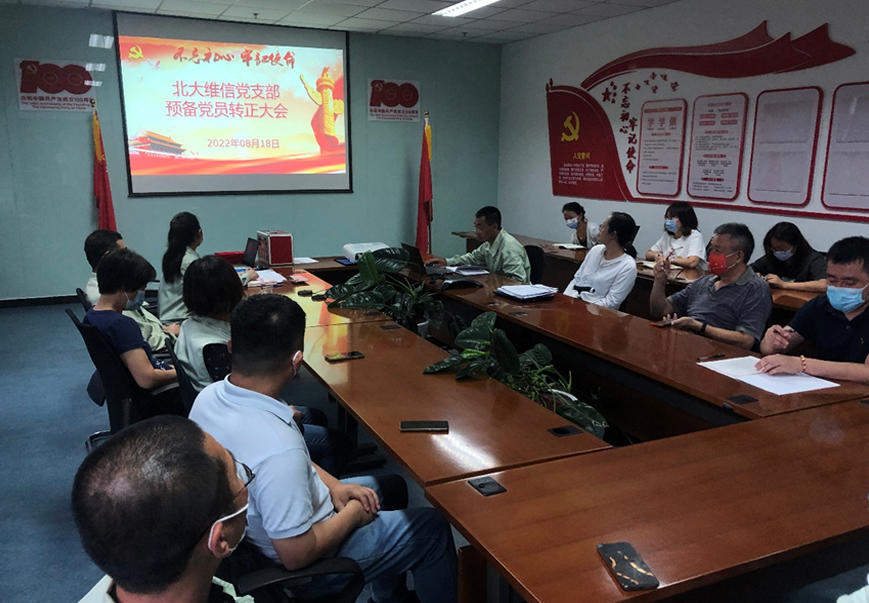 8月18日下午,北大維信黨支部在黨群活動室舉行北京市第十三次黨代會精神宣講報告會暨預(yù)備黨員轉(zhuǎn)正大會。大會由黨支部書記劉煒主持,支部黨員、預(yù)備黨員及部分團干部參加了會議。