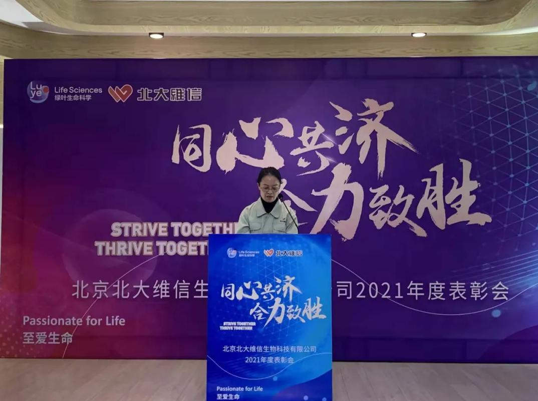 綠葉生命科學(xué)集團資深副總裁薛云麗女士通過視頻錄播的形式,將對北大維信過去一年業(yè)績的鼓勵和肯定,對北大維信未來的寄語和展望帶到了北大維信總結(jié)表彰現(xiàn)場。